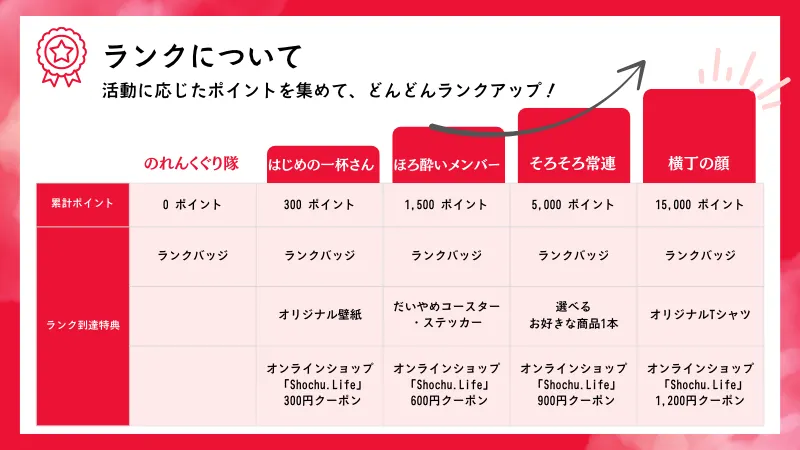 横丁内での様々な活動に応じて「ポイント」が貯まり、ポイント数に応じて「ランク」がアップしていきます!